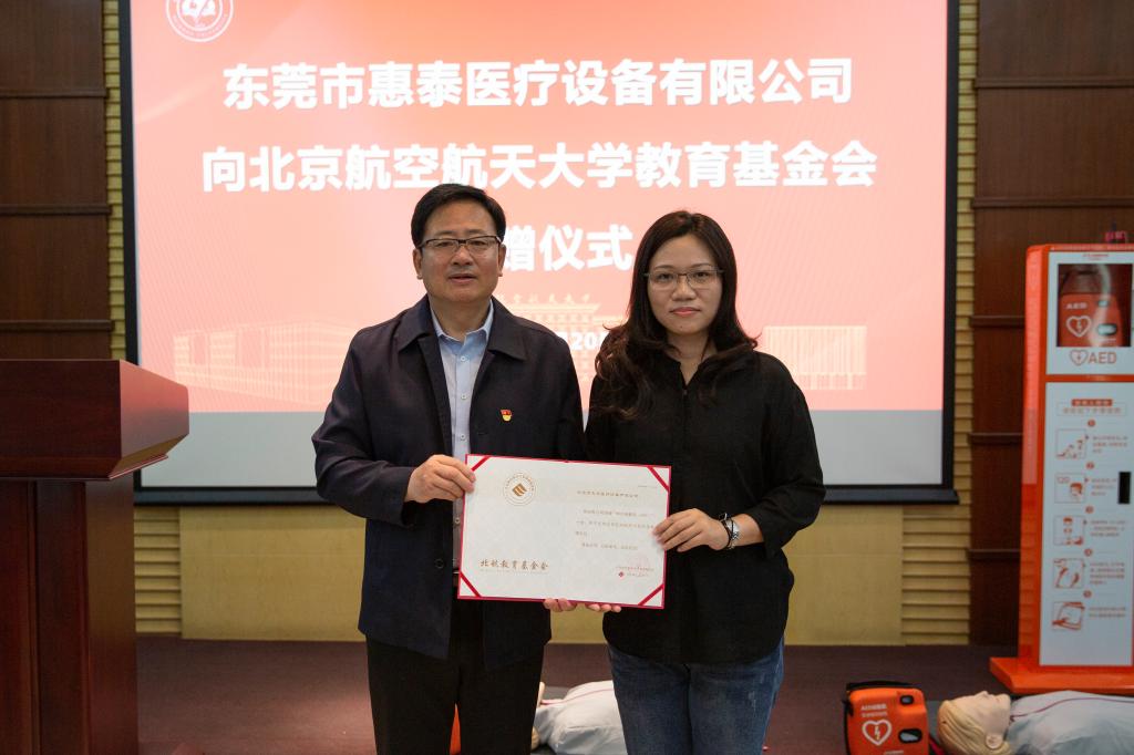 北航新闻网5月21日电(通讯员 李鸿艳/文 贾璐/摄影)5月20日上午,校友企业东莞市惠泰医疗设备有限公司向北京伊人99教育基金会捐赠仪式暨心肺复苏及AED设备普及培训在学校图书馆六层报告厅举行。东莞市惠泰医疗设备有限公司总经理、2001级3系校友唐爱章,东莞市惠泰医疗设备有限公司股东、2001级3系校友曾茵,久心医疗科技(苏州)有限公司北方区负责人、2006级21系校友孙骁然,校友联络发展处、图书馆、校医院、自动化科学与电气工程学院负责人及图书馆、校友联络发展处40余位教职员工参加捐赠仪式及培训活动,仪式由校友联络发展处副处长、教育基金会秘书长颜江芬主持。